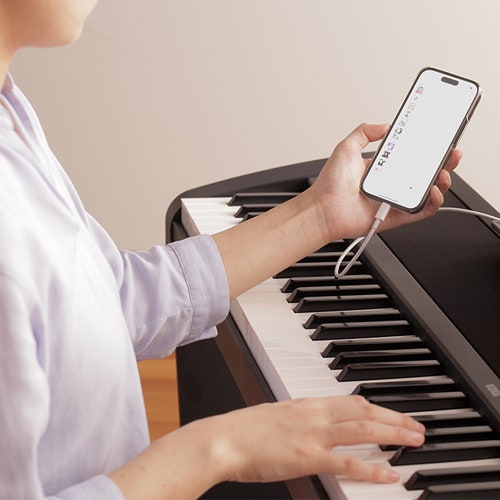 With a USB cable*, you can connect the B2+ to a smartphone, tablet, or computer, and use it as a MIDI keyboard to control external sound modules or music apps. You can also record your performance as music data to your smartphone, and play audio from your device through the B2+ speakers, creating a seamless setup for practice, composition, or recording.