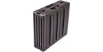 Helgjuten racklåda gjutna i tre delar; kropp, framsida och baksida. Handtagen är ingjutna i kroppen, hela racklådan vilar på stötdämpande gummifötter.