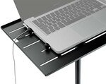 Den fasta bordsskivan på 479 x 312mm har en kant för att mindre prylar inte ska rulla av samt flera spår där man kan fästa dom fyra gummiklädda plupparna för att ytterligare hålla sin laptop på plats. Bordsskivan har även en kabelkanal så strömkabeln till datorn inte behöver gå över kanten.