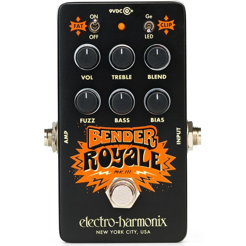 Med Fat-switchen så adderas ytterligare bas och ett lågt mellanregister för att boosta och göra din ton än fetare och Clip-switchen låter dig ändra karaktären på hur tonen "klipper" och därmed ändrar karaktär på själva fuzz-effekten från Germanium- till LED-Fuzz vilket ger en råare ton som påminner om de allra tidigaste fuzz-pedalerna. Bias-kontrollen styr strömstyrkan till fuzz-kretsarna och tar dig från en mjuk följsam fuzz-effekt till en överstyrning som som nästan skriker. För att kontrollera diskanten har Electro Harmonix valt att använda en aktiv Treble-kontroll som tyglar eller släpper på de höga registren, allt utefter tycke eller smak. Vill du kombinera Bender Royale tillsammans med andra dist- eller fuzz-boxar eller vill ha mer av direktsignalen så hjälper Blend-kontrollen att ställa nivån mellan fuzz- och direktsignalen.