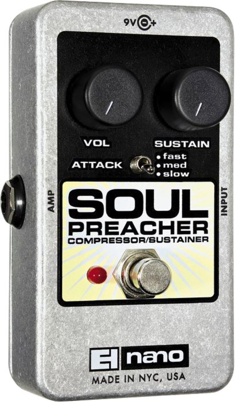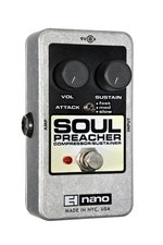 Electro-Harmonix Soul Preacher is an effect pedal that offers 3 selectable attacks coupled with silky, long sustains. The switch selectable attacks offer super articulate compression. Let your guitar step forward without squeezing the life out of your tone. Heavenly sustain ...sonic salvation.