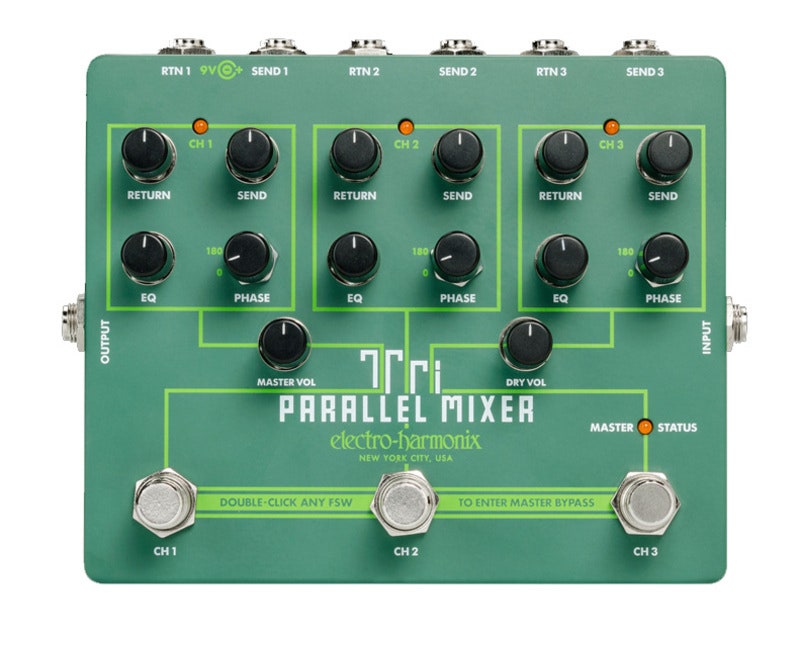 Electro Harmonix’s Tri Parallel Mixer is a powerful effects creation and mixing hub. Three separate FX loops with flexible controls allow for multiple configurations, as follows: