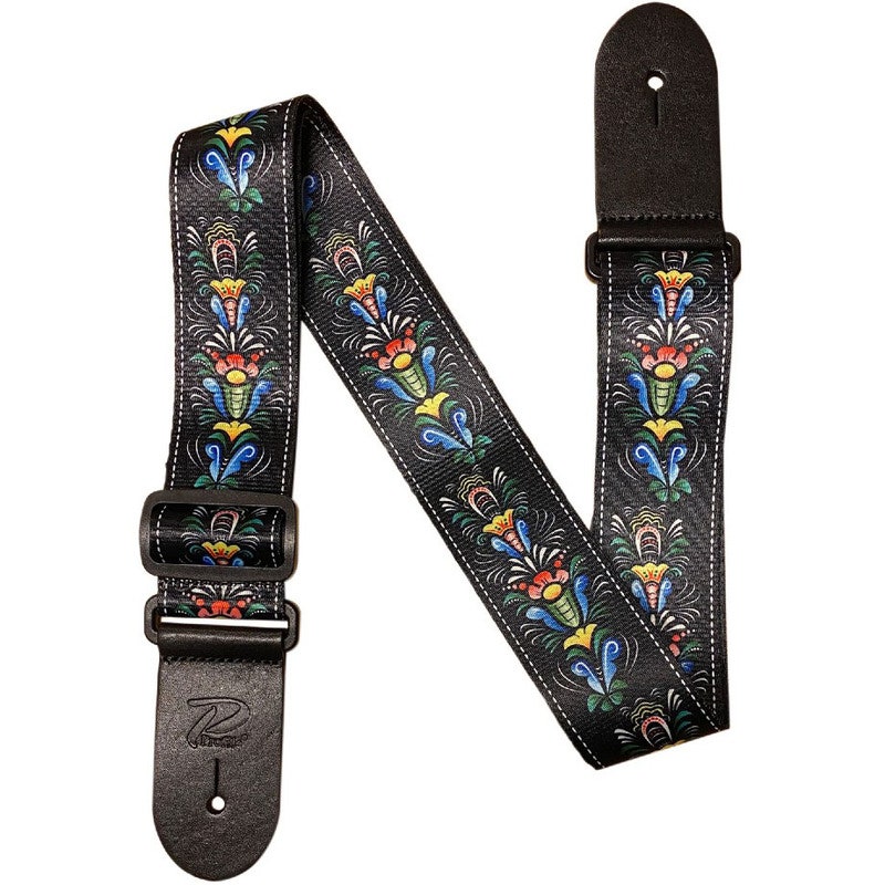 Artikelnummer 3421020Axelband i polyester till bas & gitarr, ändar i italienskt läder, slitstarkt, svart med Kurbits-motiv.