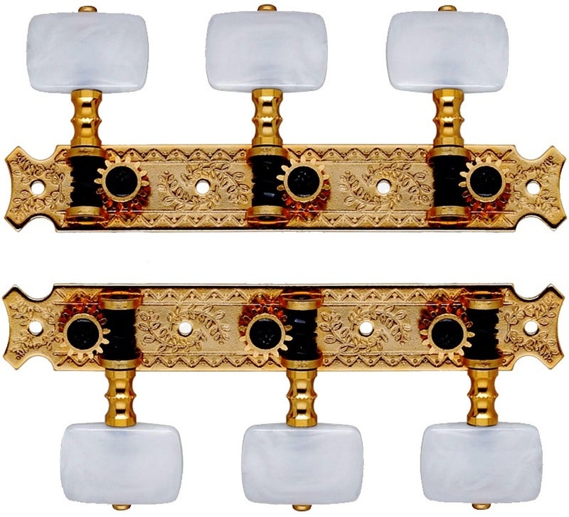 Stämskruv för nylonsträngad gitarr. Guld med vita knappar i pärlemor.