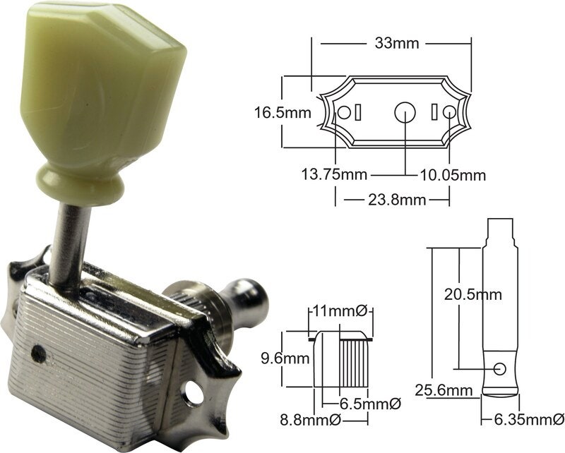 Stämskruv för elgitarr. 3 Vänster, 3 höger. Nickel. med vintage-style tulip-knappar