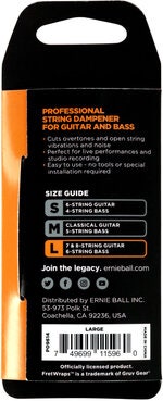 En oumbärlig tillgång när strängar behöver dämpas t ex vid inspelning eller när det är tapping på greppbrädan som gäller. Skjut ditt Fretwrap över strängarna för att ta bort ovälkomna övertoner och lösa strängar som du inte vill ska ringa, med det justerbara bandet bestämmer du hur mycket du vill att strängarna skall dämpas. När du vill få tillbaka dina övertoner och vill nyttja de öppna strängarna skjuter du bara upp ditt Fretwrap ovanför översadeln och allt är som vanligt igen. Inga modifikationer, installationer eller extra verktyg krävs, Fretwrap dämpar effektivt dina strängar på ett enkelt sätt och finns i tre storlekar för olika sorters gitarrer och basar. Large - passar 7 & 8-strängade elgitarrer och 6-strängade basar.