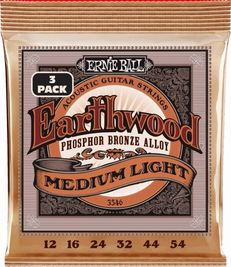 Ernie Ball 3546 Earthwood Phosphor Bronze Medium Light 3-pack för stålsträngad akustisk gitarr.