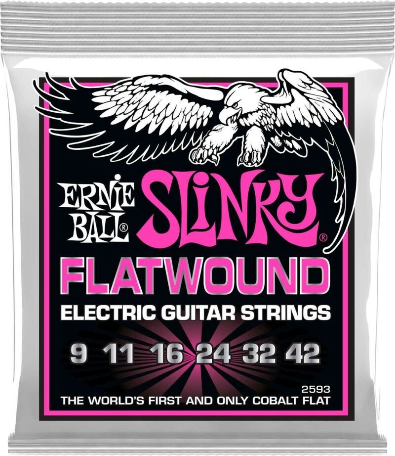 Ernie Ball Slinky Flatwound strängar för elgitarr kombinerar den klassiska tonen och spelbarheten från Slinky strängarna med den släta ytan som reducerar ljud från fingrarna precis som traditionella "slipade" strängar. Lindningen runt kärnan består av en patenterad koboltlegering, resultatet är en sträng som passar perfekt för de som vill addera ett nytt sound till sin palett.