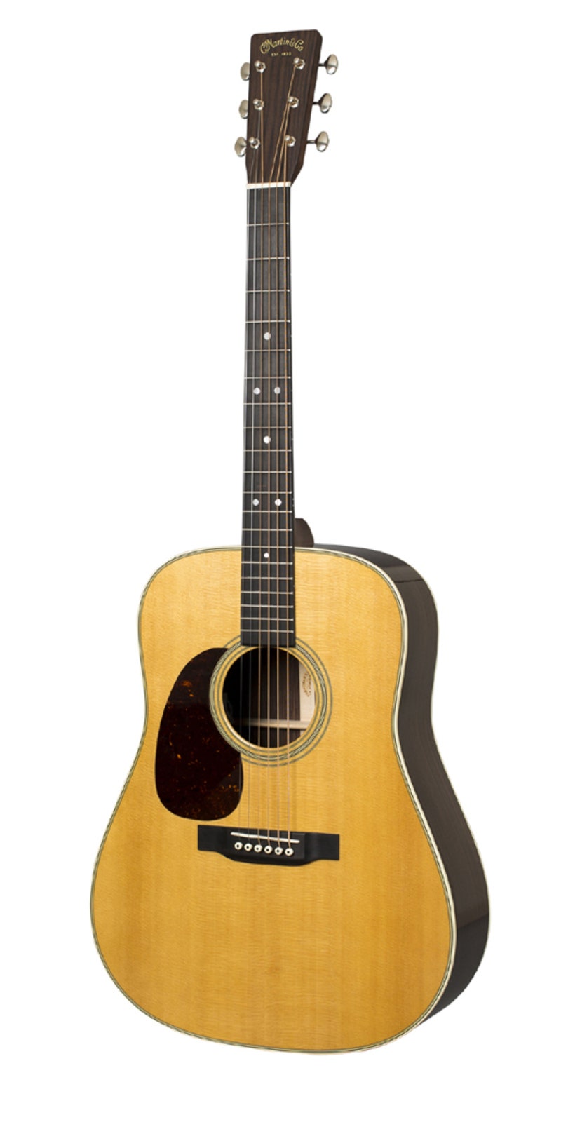 Martin D-28 betraktas av många som världens mest ikoniska akustiska gitarr och därmed varit ett självklart val för generationer av musiker och spelad av otaliga legendarer inom en rad olika genrer. Dess klassiska Dreadnought-kropp och urfrästa (scalloped) X-ribbor ger ett kraftfullt, välprojekterande ljud med djup bas, klar diskant och fylliga övertoner.