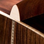 Designen är lika vacker som tonen med flammig lönnbindning, guldplätterad, öppen stämmekanik och logo i pärlemorinlägg.
