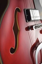 Även Alvar har ihålig kropp av laminerad lönn, välvt lock & hals av maple med greppbräda i Resinator Wood men med en nättare & mindre kropp.