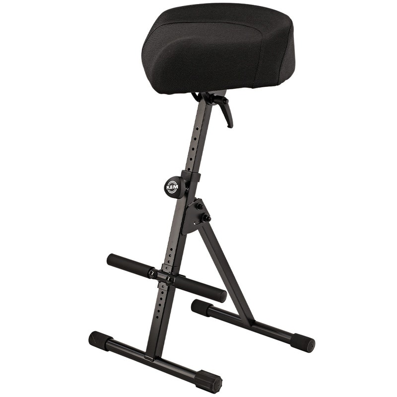 K&M 14044 har justerbar höjd i flera steg mellan 650 - 930mm, en formad sits klädd i tyg och passar utmärkt till ex. keyboardisten, gitarristen eller slagverkaren som behöver sitta men även har behov av att komma högt upp.