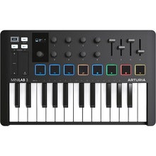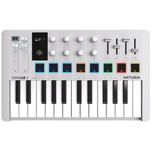 MiniLab 3 Champagne är en bus-driven USB-MIDI-kontroller med 25 slim-keys och full DAW-integration via MCU/HUI. Den stöder VST, AU och AAX i 64-bitarsmiljö och är fullt kompatibel med Arturias Analog Lab V och övriga Arturia-mjukvaruinstrument.