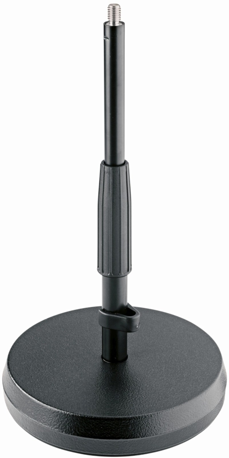 Kort 2-delat och justerbart mikrofonstativ med rund fot. Svart.