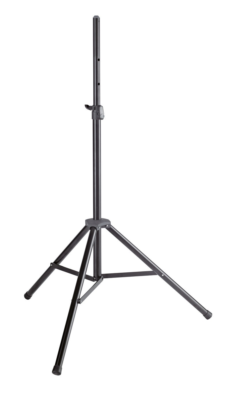 Stable and sturdy speaker stand with aluminum tubes. Reliable base tubes with 35 mm diameter and large rubber end caps guarantee a stable and safe stand. The compact clamp with the patented push-button system enables a user-friendly height adjustment of the stand. The clamping screw provides additional stability and a vibration-free hold of the speaker. Further special features are the pull-out guard for the extension tube, the integrated shock absorber and mounting aid for the speaker cabinets. The stand is foldable for easy transport.
