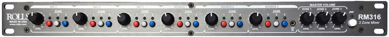 RM316 Three Zone Mixer kombinerar tre mikrofoner eller XLR-linjenivåsignaler med tre RCA-linjenivåingångar.