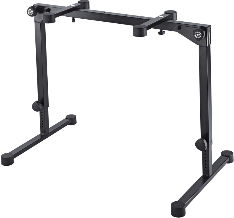 Stativet är tillverkad i en robust stålkonstruktion och kan justeras i höjd från 600 - 1020mm i flera olika lägen. Bredden är fast men supportstagen som man ställer klaviaturet på är justerbara så bredden är mellan 122 och 729mm i flera olika steg. Modellen har 4st justerbara fötter så stativet ska stå stabilt även på ett ojämnt golv..