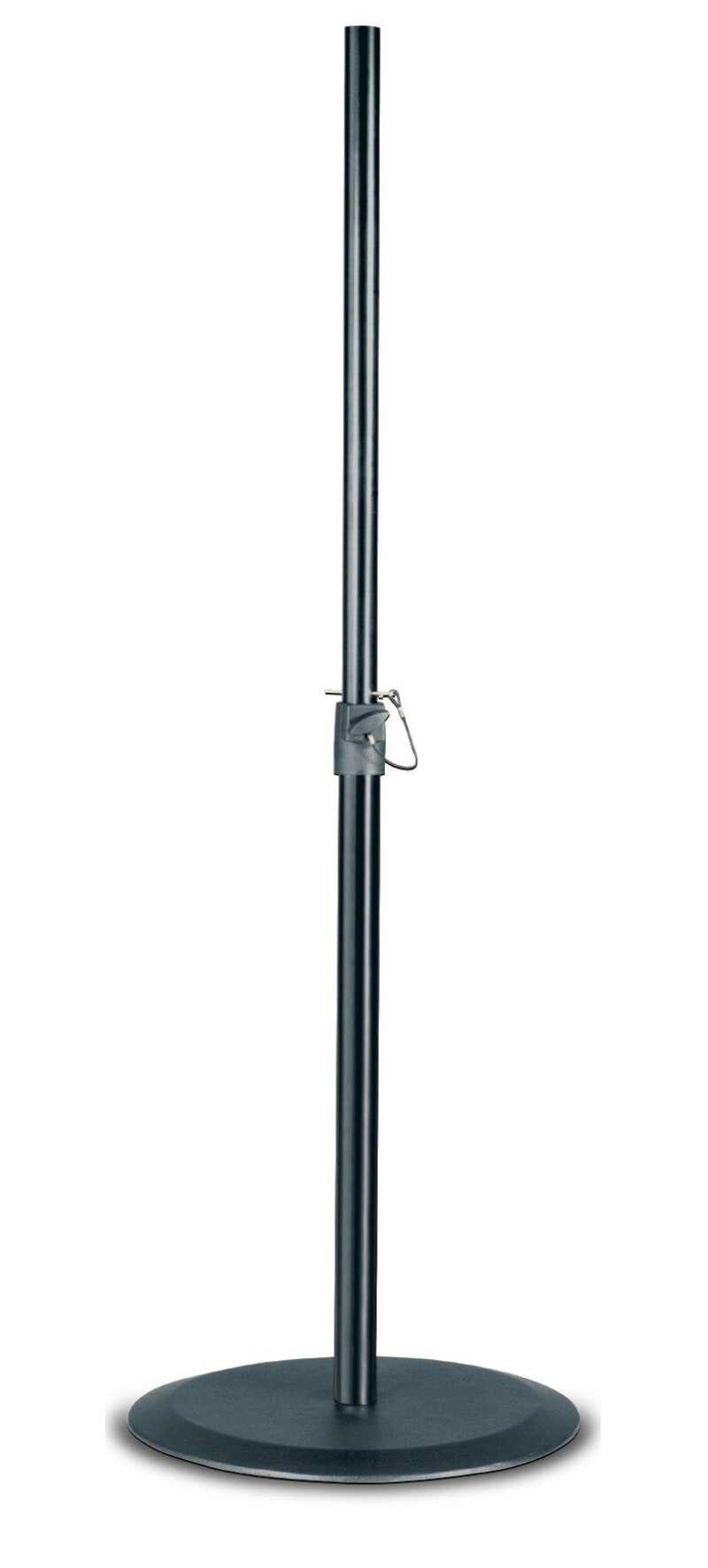 Stabilt högtalarstativ tillvekat i stål med rund fot. Justerbar i höjdled.