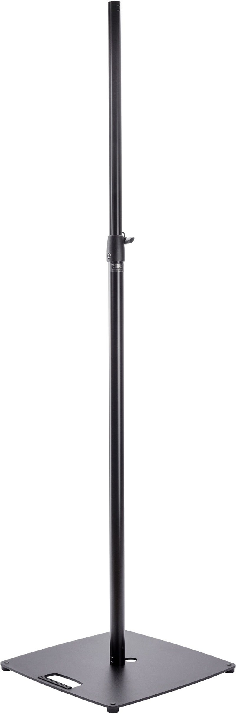 Attractive stand for lights and speaker cabinets. Thanks to the heavy, flat steel plate, the stand is suitable for use where space is at a premium. A carrying handle, a cable management and four sturdy feet are further useful features. The height is fixed with a safety hook and secured with a low-noise, backlash-free clamping screw. The slim design of the clamp enables space-saving transportation and ensures a stylish appearance. The usable height is between 1,400 and 2,400 mm and can be reached in 5 steps of 200 mm. The integrated M10 threaded bush enables the attachment of a crossbar or the direct attachment of lights. The maximum load capacity when fully extended is 20 kg.