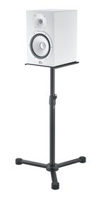 Functional floor stand for near-field monitors and speakers. The solid and well-designed steel construction impresses with its stability and holds your speakers securely in the desired position. The flat tripod construction with large rubber pads ensures acoustic decoupling and a wobble-free stand. The support plate with self-adhesive rubber studs measures 280 x 320 mm. For the optimal listening height, you can choose six levels between 677 and 1132 mm. The slim clamp with safety hook is easy and comfortable to use. Alternatively, the cables can be routed inside the tube (without connector). A load capacity of 35 kg is possible when the load is centred.