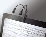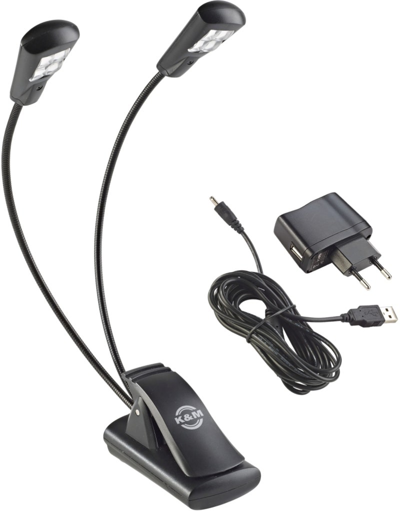 König & Meyer Music stand light "Music Stand Light Twin Head" är en batteridriven LED-belysning som drivs med batterier eller nätadapter som båda ingår. Du kan klämma fast den på material med en tjocklek på upp till 25mm. Passar bra till notställ eller på ett instrument men lika bra att fästa på en bok när du vill läsa i mörkret.