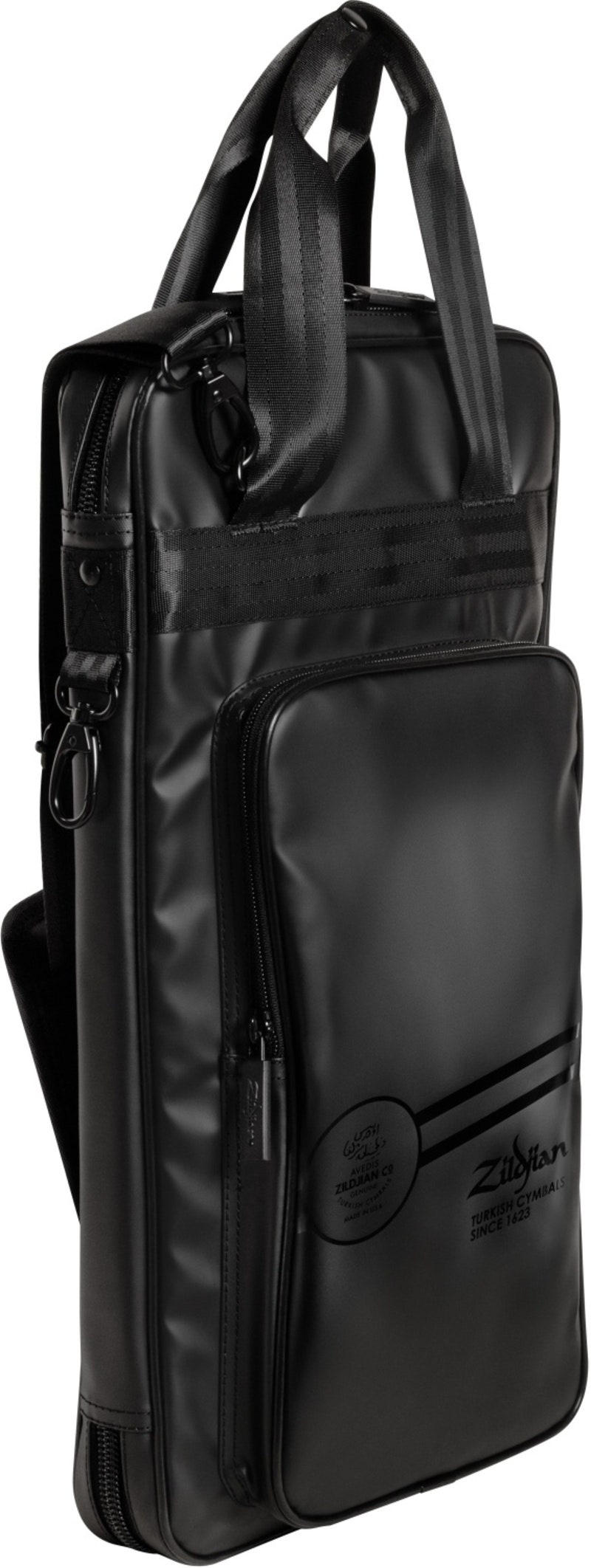 Modellen rymmer ca 12 par stockar, lite beroende på modell och storlek samt ett par vispar i det dedikerade vispfacket. Är tillverkad i ett slitstark nylonmaterial som har en yttre coating för att stå emot väta och smuts på ett utmärkt sätt. Väskan har löstagbar axelrem och flera användbara fack för tillbehör. Designen är diskret med en stilfull Zildjian-logo för hålla väskan så ren och exklusiv som möjligt.